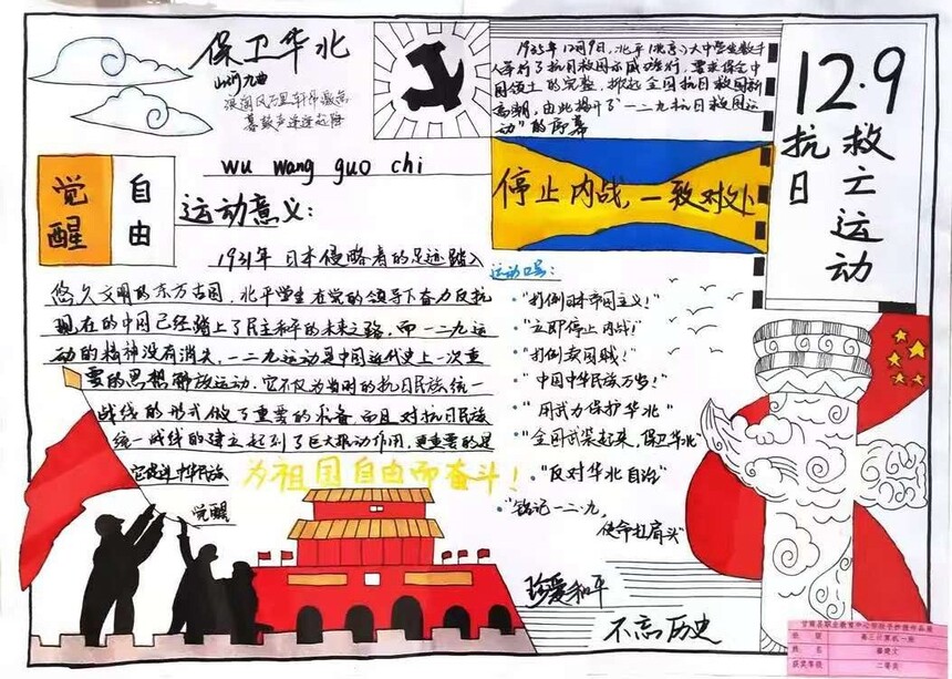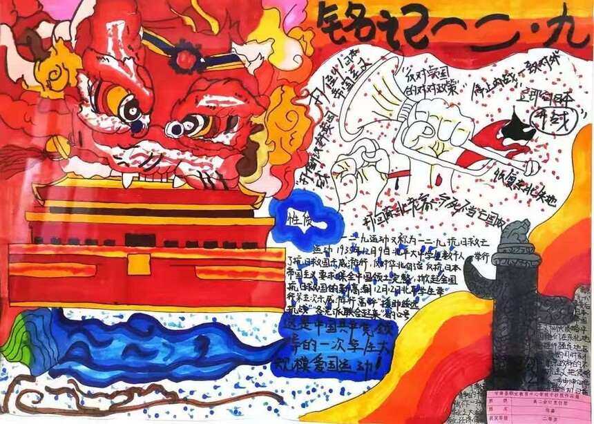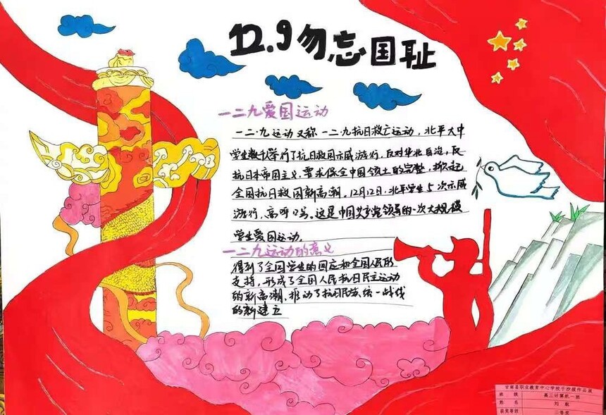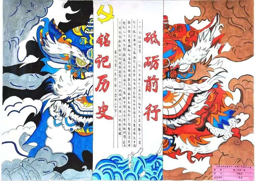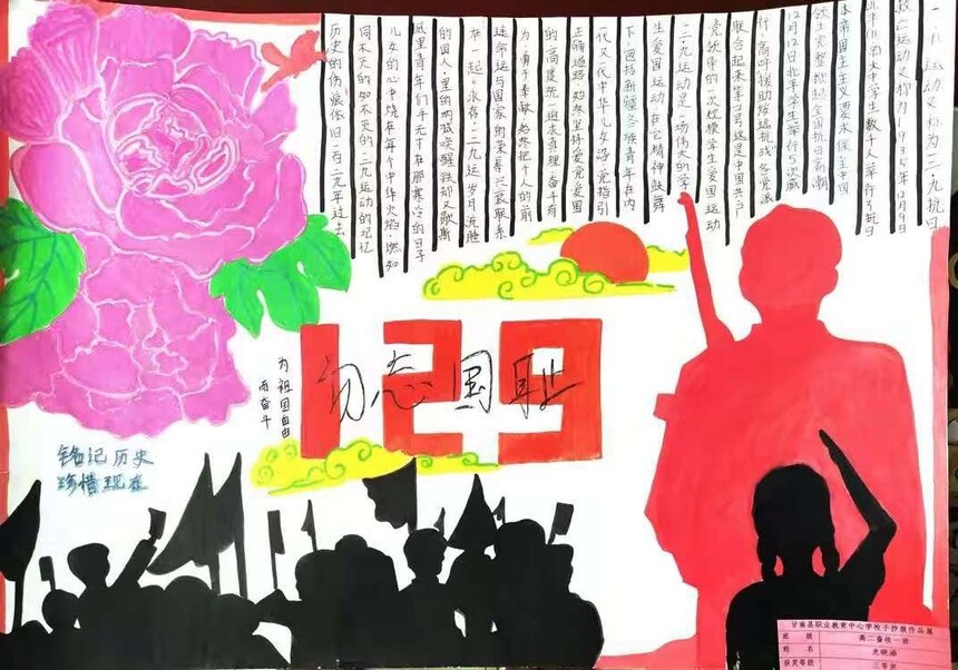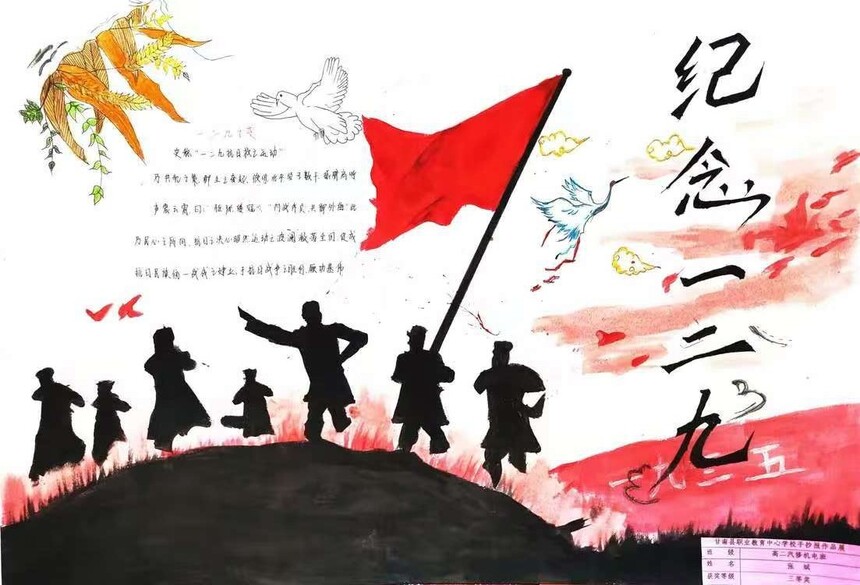 为缅怀 “一二・九” 抗日爱国运动光辉历史,弘扬爱国主义精神,引导学生树立正确历史观与民族观,激发爱国热情和时代责任感,甘南县职业教育中心学校学工处11月3至11月13日启动主题手抄报创作评比活动,面向全体在校学生征集作品。 经过评委组严格评审,最终评选出一等奖 8 名、二等奖 15 名、三等奖 16 名。获奖作品中,同学们以鲜明色彩、生动笔触再现 “一二・九” 运动的热血场景,或抒发爱国豪情,或诠释青年担当,充分展现了职教学子的历史使命感与青春风采。 获奖班级详情已附于上传图片中,望获奖同学珍惜荣誉、再接再厉,未获奖同学汲取经验、奋勇争先。此次活动不仅丰富了校园文化生活,更让红色基因融入青春血脉,激励全校师生铭记历史、砥砺前行,以昂扬姿态书写新时代青年的责任与担当。