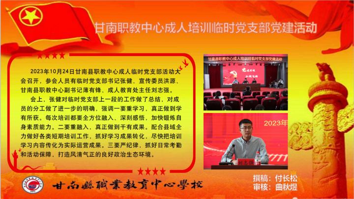 2023年10月24日甘南县社区教育学院成人临时党支部活动大会召开,参会人员有临时党支部书记张建、宣